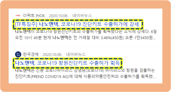 2020년 10월, 나노엔텍이 코로나의 항원을 검출할 수 있는 코로나 항원진단키트에 대해 식약처에 수출허가를 획득했다고 밝표했었습니다.