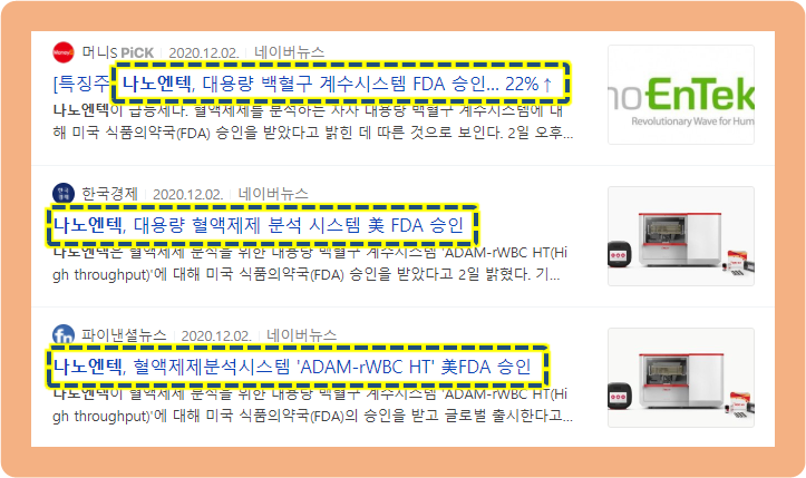 2020년 2월, 나노엔텍이 혈액제제를 분석하기 위한 대용량 백혈구 계수시스템인 "ADAM-rWBC HT"에 대해서 미국의 FDA(식품의약국) 승인을 받았다고 발표했습니다.
