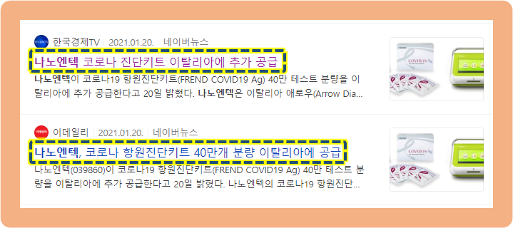 2021년 1월 20일, 나노엔텍이 코로나 항원진단키트 약 40만개의 테스트 분량을 이탈리아에 추가적으로 공급한다고 발표했습니다.