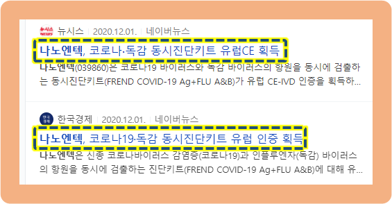 2020년 12월 1일, 나노엔텍은 코로나와 독감 바이러스의 항원을 동시에 검출할 수 있는 동시진단키트가 유럽 CE-IVD 인증을 획득하였고, 유럽시장에 출시한다고 발표했습니다.