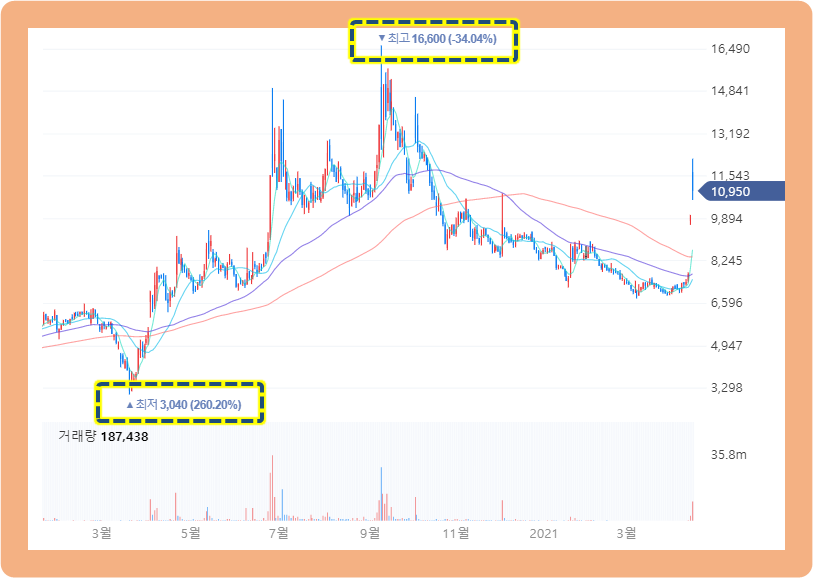그리고 이후 주가는 큰 폭으로 등락을 반복하다가, 2020년 9월 8일에 최고점 16,600원까지 터치했습니다. 최저점에 비하면 약 5배 오른 수치이죠.