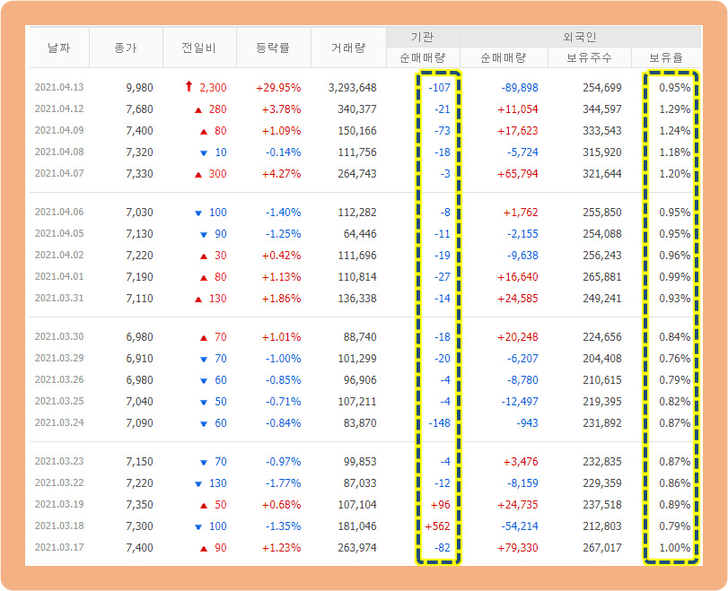 그리고 전 날인 2021년 4월 12일, 오세훈 시장이 "서울시는 자가진단 키트에 관하여 식약처의 신속한 사용승인을 촉구한다"는 의견을 밝힌 바 있었는데요. 이와 함께 신속항원검사키트를 활용한 시범사업도 적극 검토하겠다고 했었죠. 그에 대한 수혜도 받았구요. 호재는 많았네요.