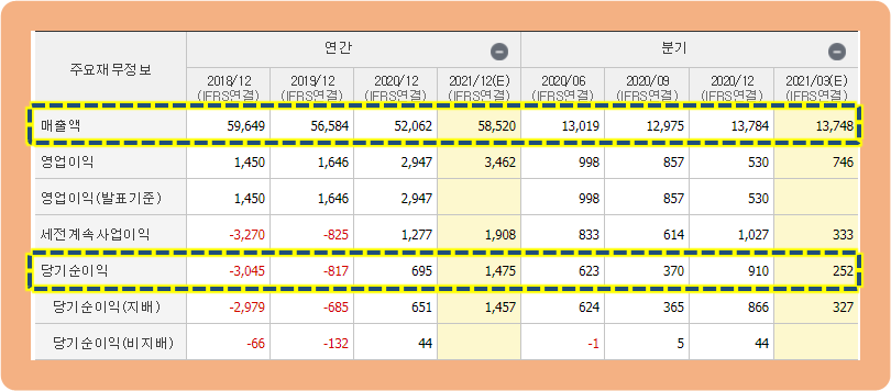 그리고 연간 당기순이익의 경우, 2018년도 -3,000억원 적자와 2019년에도 -814억원 적자를 기록했었는데요. 2020년도 기준으로 +695억원 을 기록하면서 흑자 전환에 성공한 상황입니다.