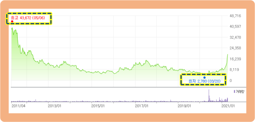 과거 10년 간 동국제강의 주가 변동 추이를 보도록 하겠습니다. 최고점은 2011년 5월에 기록한 43,672원이고, 최저점은 2020년 3월에 기록한 2,780원입니다.
