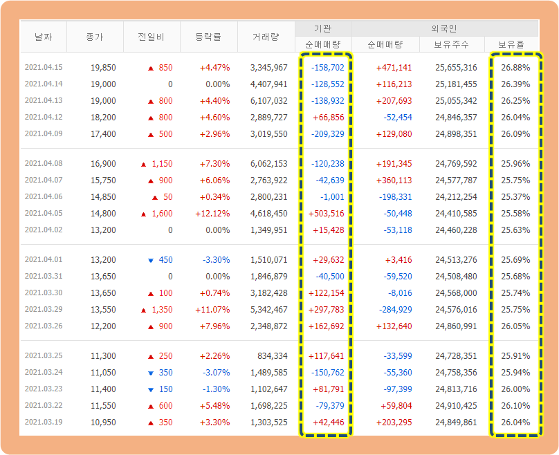외국인 투자자의 지분율은 지난 한 달 동안 25~26% 수준을 계속해서 유지하고 있네요.