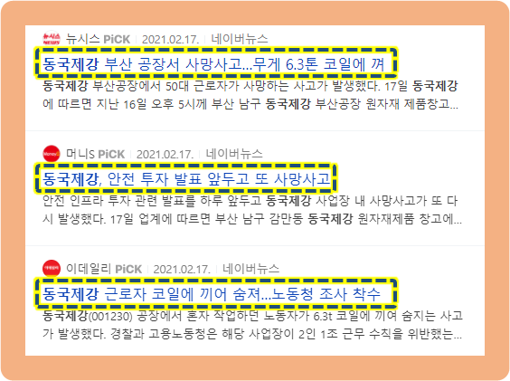 2021년 2월 16일, 동국제강 공장에서 작업 중인 근로자의 사망사고가 또 발생했습다. 지난 1월 동국제강의 포항공장에서 식자재 납품업 근로자가 화물 승강기에 끼여 사망한 사고가 일어난 지 한 달만에 또 발생한 것인데요.