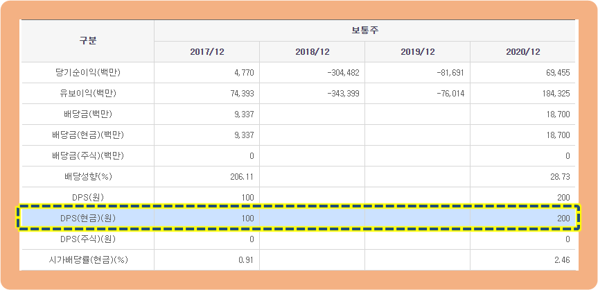 2017년도에는 1주당 배당금 100원을 지급했었는데요. 2018년도와 2019년도에는 실적 악화로 인해 주식 배당을 실시하지 못하고 있었습니다.