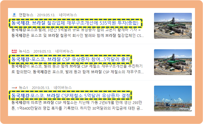 이 소식은 2019년도 5월에 있었던 내용이죠. 동국제강이 포스코와 브라질 철광석 기업인 발레와 함께 브라질 철강업체인 CSP 제철소의 재무구조개선에 대해 투자한다는 소식입니다.