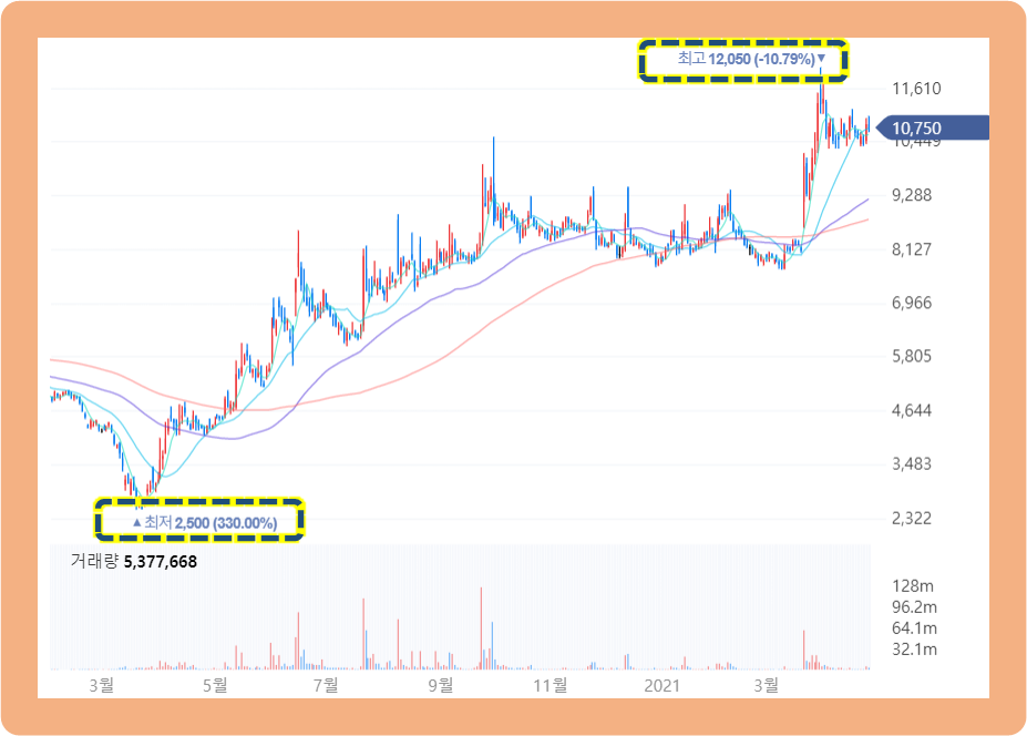 우선 2020년 3월경, 코로나 주식 시장 하락 사태로 인해 주가는 최저 2,500원까지 하락했었는데요.