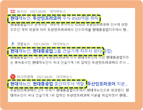 2021년 4월 9일, 현대중공업가 현대제뉴인이 두산인프라코어 주식 7550만9366주를 약 8,500억원에 취득하였다는 공시를 발표했습니다. 이번 주식 취득으로 인해 현대제뉴인이 두산인프라코어의 지분 약 35%을 가지게 되었는데요.