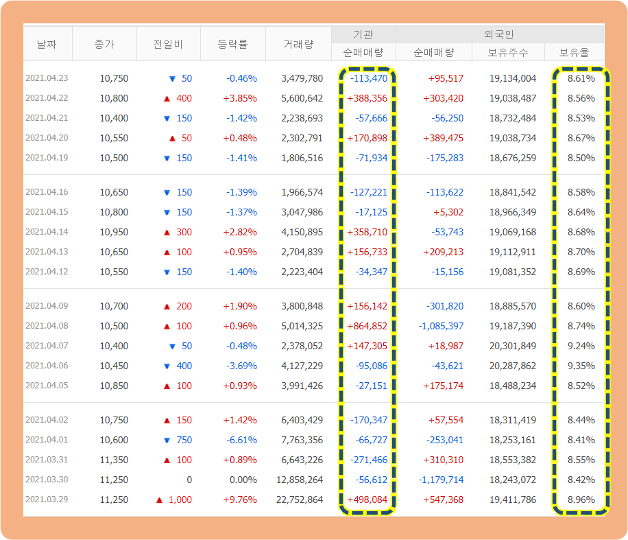 그리고 외국인 투자자의 지분율은, 지난 한 달 간 약 8%대를 꾸준하게 유지하고 있는 모습이네요. ( 4월 6일과 7일에 잠깐 동안 9%대로 올라오긴 했습니다.)