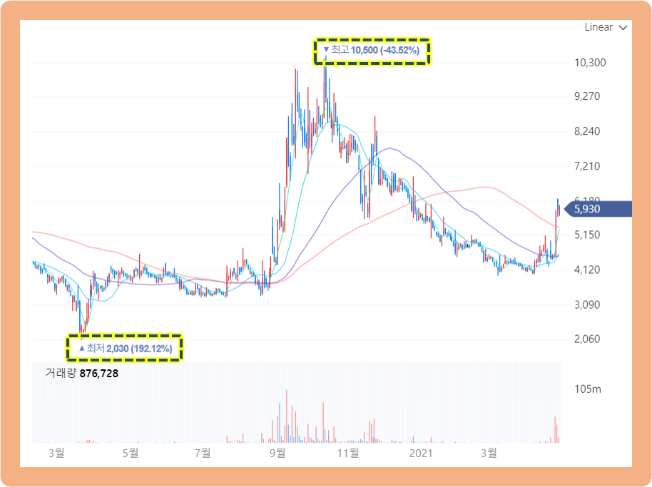 그리고 약 4~5개월 동안 횡보가 지속되고 있었는데요. 그러던 중 2020년 8월 25일부터 주가가 갑자기 급등하기 시작하더니, 계속 치솟으면서 2020년 10월 14일에는 최고 10,500원까지 기록했습니다.