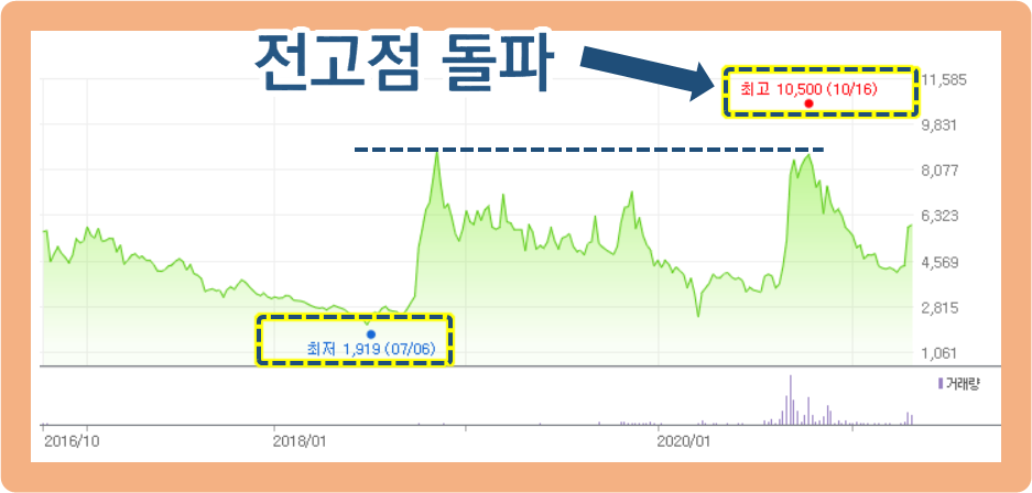 2020년 10월에 10,500원을 기록하면서 약 3년 전 전고점을 돌파하게 된 것인데요. 아쉽게도 지금은 다시 조정을 받으면서 약 6,000원대까지 내려온 상황입니다.