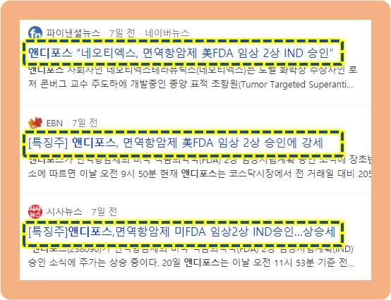 2021년 4월 20일, 앤디포스의 자회사인 네오티엑스가 노벨 화학상 수상자인 로저 콘버그 교수 주도하에 개발하고 있는 종양 표적 초항원 플랫폼 기반의 면역 항암제인 "냅투모맙"에 대해서 미국 FDA로부터 2상 임상시험계획을 승인받았다고 발표했습니다.