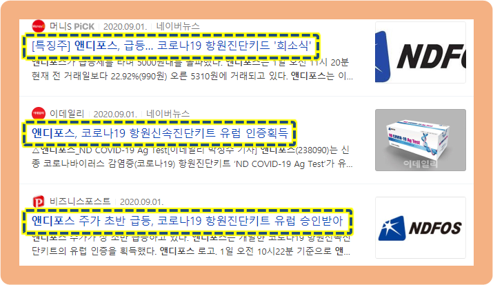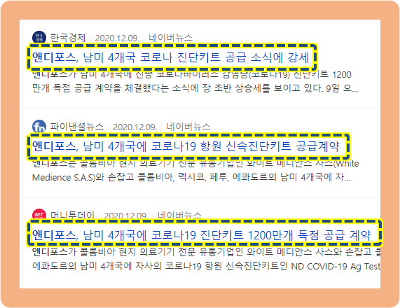그리고 약 두 달 뒤인 2020년 11월, 앤디포스가 코로나와 독감을 동시에 진단 가능한 항원 신속진단키트의 수출 허가 획득 소식을 발표했는데요.