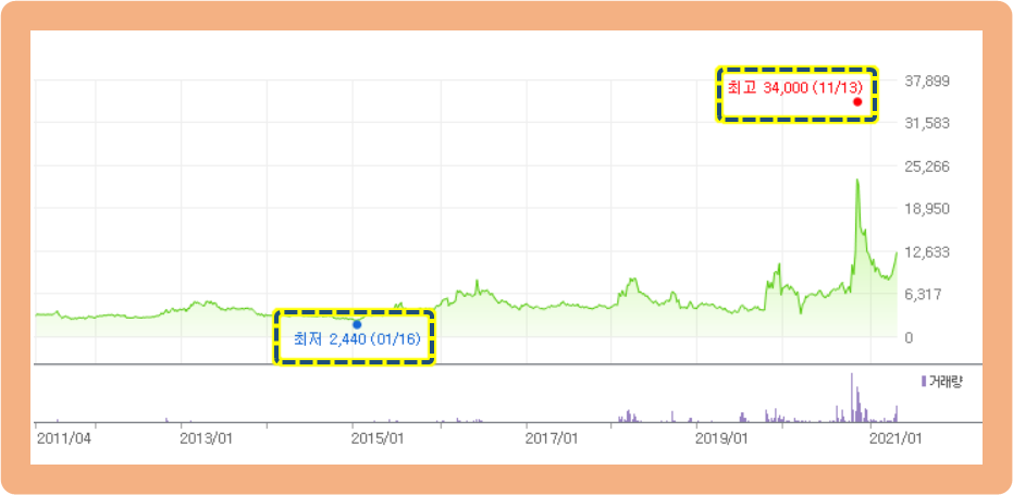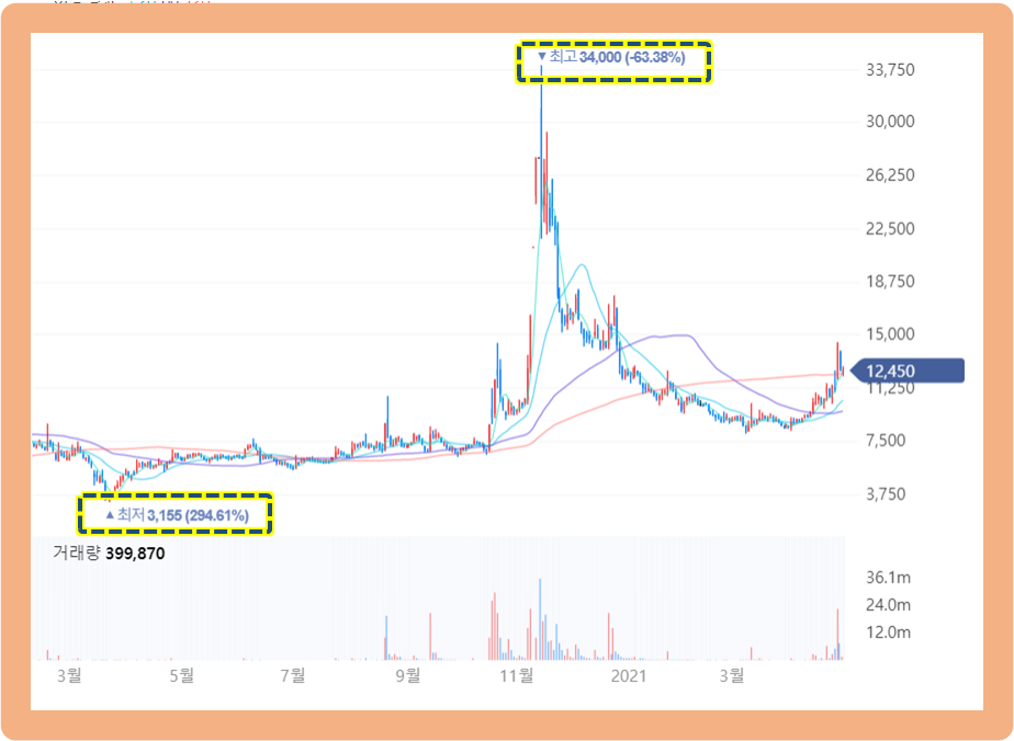 그리고 약 7개월 뒤인 2020년 10월 19일부터 주가가 갑자기 급등하기 시작했는데요. 며칠간 주가는 계속 치솟으면서 2020년 11월 13일에는 최고점 34,000원까지 기록했습니다.