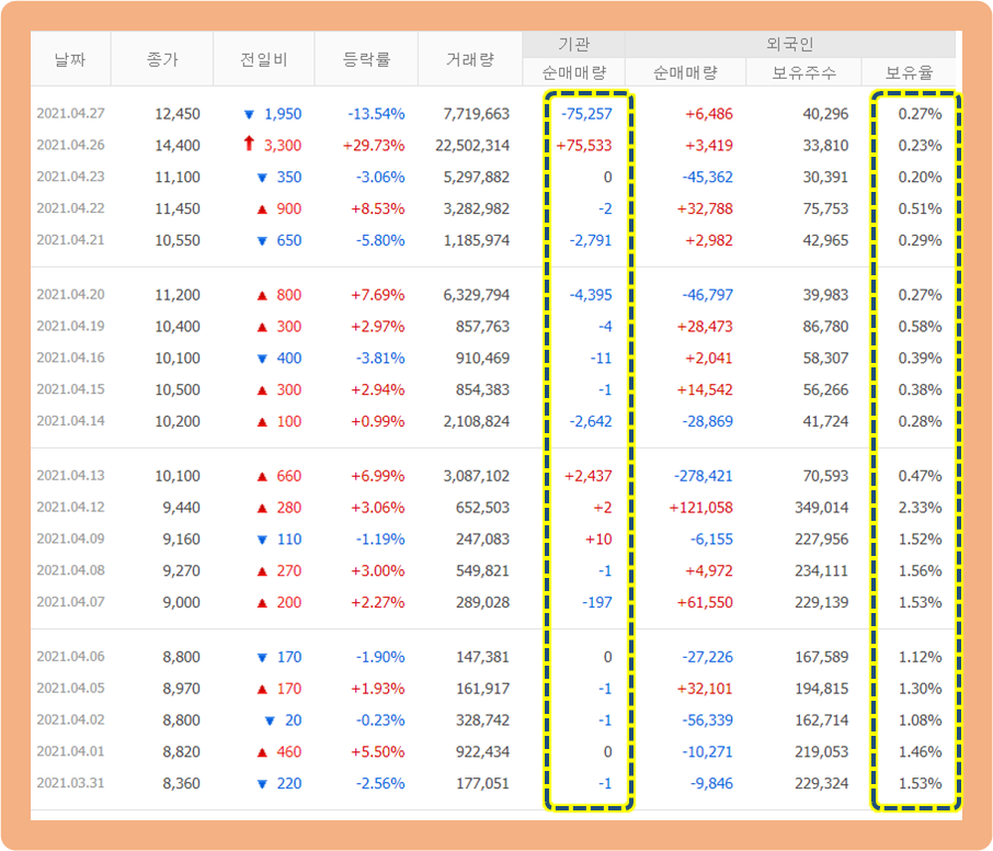 기관 투자자 및 외국인 주식 매매 추이