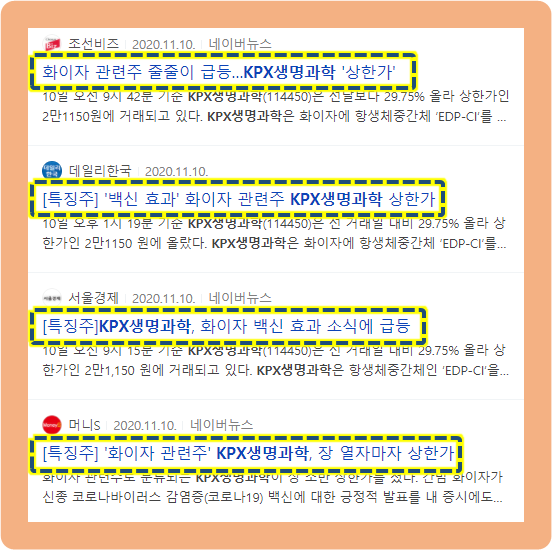 그리고 이 당시, 화이자 코로나 백신 개발 관련 소식으로 인해 KPX생명과학 주가가 며칠 동안 계속 급등한 것이였죠.