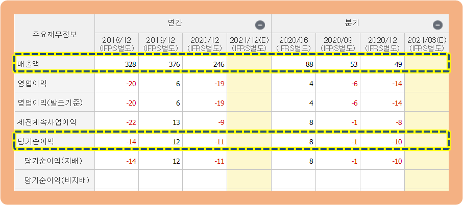 그리고 당기순이익은 2018년도에 -14억원 손실이였는데, 2019년도에 +12억원을 기록하면서 흑자 전환에 성공했었습니다. 하지만 2020년에는 다시 -11억원 손실을 기록하면서 적자 전환이 된 모습이네요.