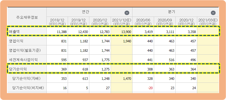 그리고 당기순이익을 보시면, 2018년도 : 369억원 / 2019년도 : 618억원 / 2020년도 : 1,275억원을 기록하면서 큰 폭으로 성장하고 있는 모습이네요.