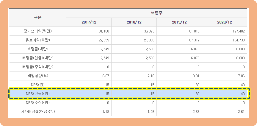 2017년, 2018년 : 15원 / 2019년 : 30원 / 2020년 : 40원을 지급해줬는데요.