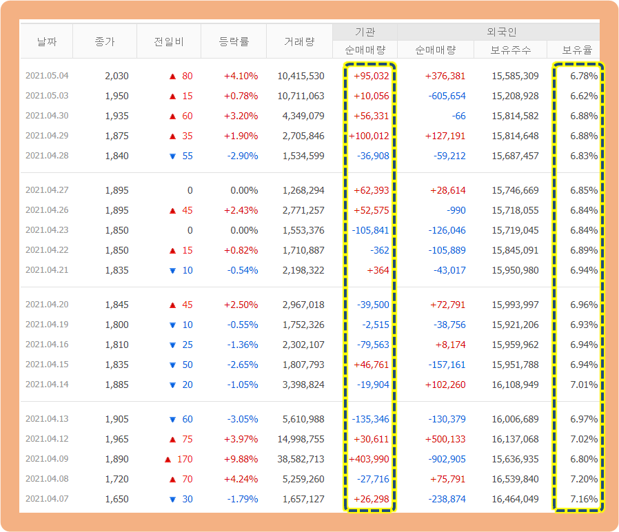 지난 한 달 동안 기관과 외국인 투자자의 주식 거래 동향을 살펴보도록 하겠습니다.