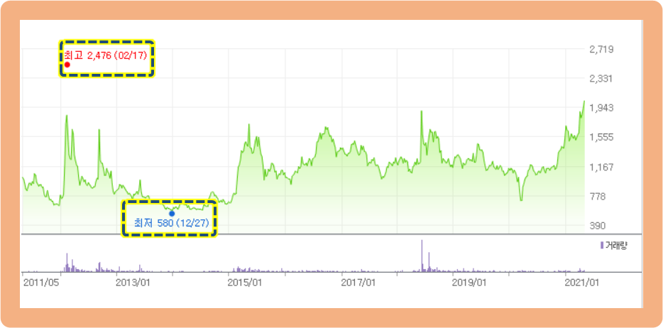2020년 3월, 코로나로 인한 주식 시장 하락 사태 때 최저 636원까지 하락했었습니다.
