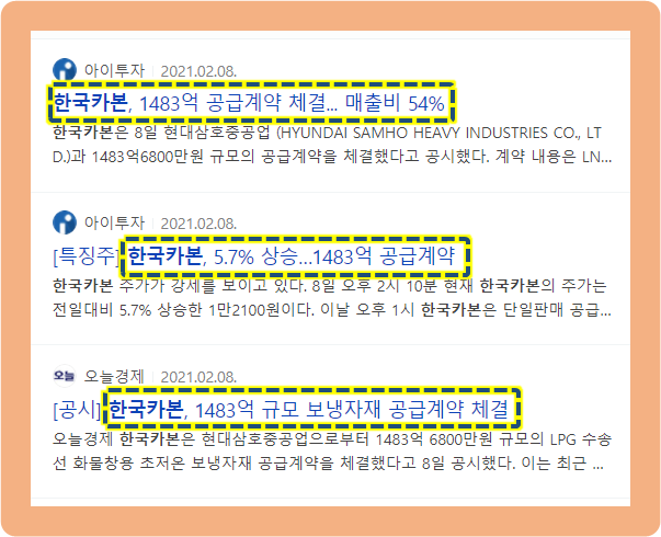 2021년 2월 8일, 한국카본이 현대삼호중공업과 약 1483억원 규모의 공급계약을 체결했다는 공시를 발표했습니다.
