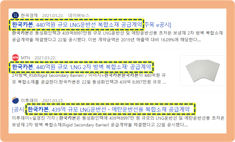 2020년 12월 9일, 한국카본이 삼성중공업과 LNG 수송선의 화물창용 초저온 보냉자재를 공급하는 계약을 맺었다는 공시를 발표했습니다.