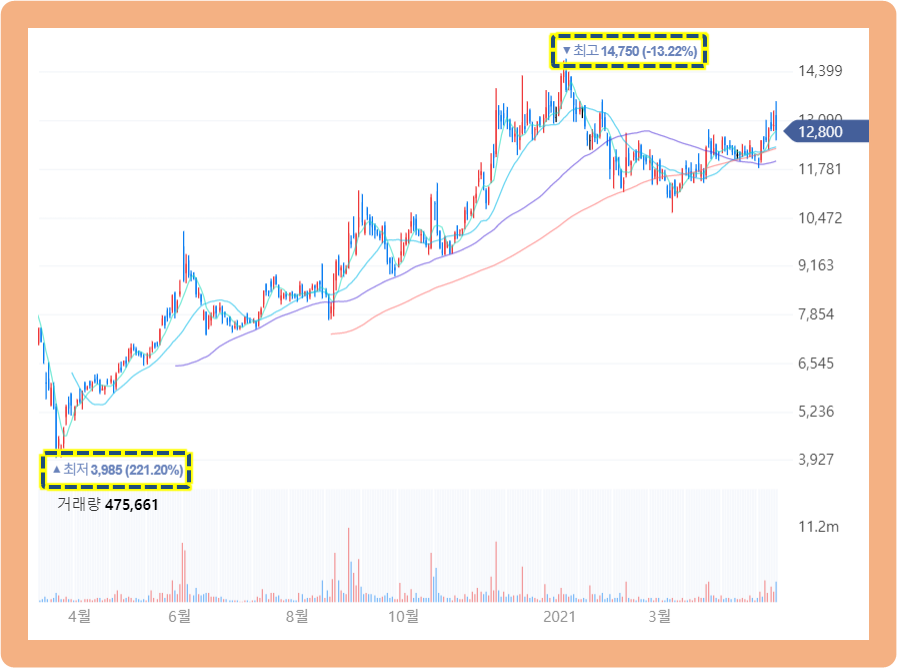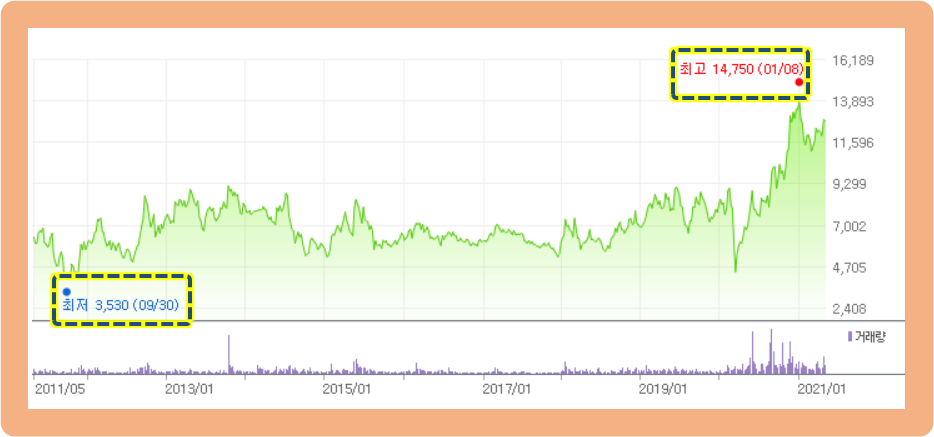 그리고 2021년 1월 6일에 최고점 14,750원까지 기록했었는데요. 지금은 최고점 터치 후 어느 정도 조정을 받으면서 주가가 소폭 하락한 모습이네요.