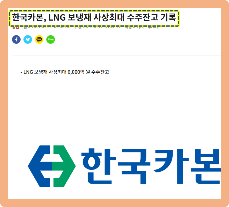 한국카본은 바로 위에서 말씀드린 현대삼호중공업과의 대형 수주로 인해 역대 최대 LNG 보냉재 수주잔고를 기록하게 되었다고 합니다.