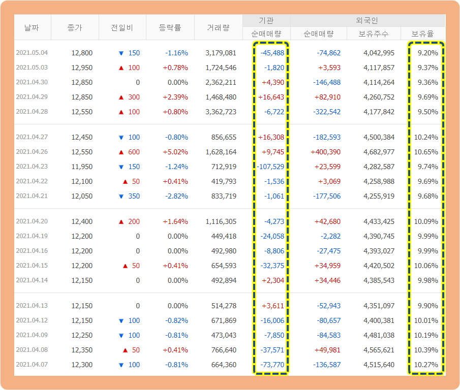 지난 한 달 동안 기관투자자 및 외국인 투자자의 주식 매매 추이를 살펴보도록 하겠습니다.