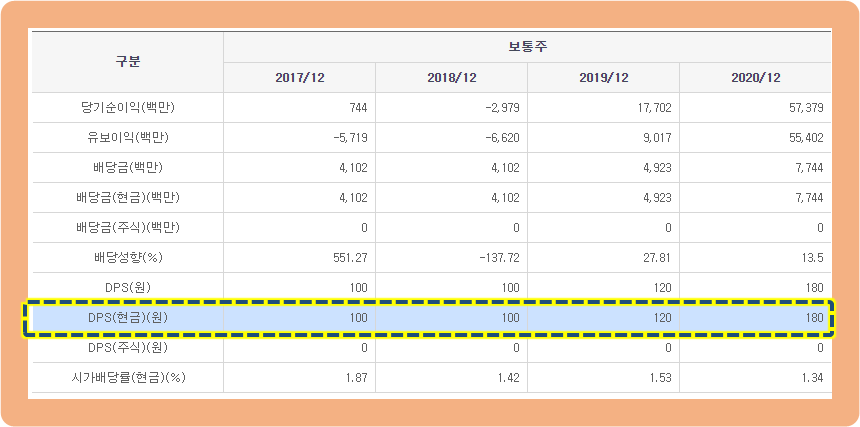 2017년, 2018년 : 100원 / 2019년 : 120원 / 2020년 : 180원의 배당금을 지급해줬구요. 배당 수익률은 1%대를 유지하고 있습니다.
