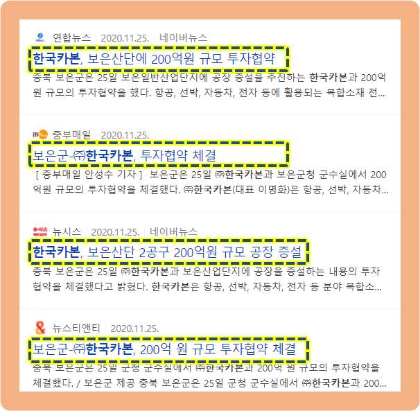 2020년 11월 25일, 한국카본과 충청북도 보은군이 약 200억원 규모의 투자 협약을 체결했다는 소식이 발표되었습니다.