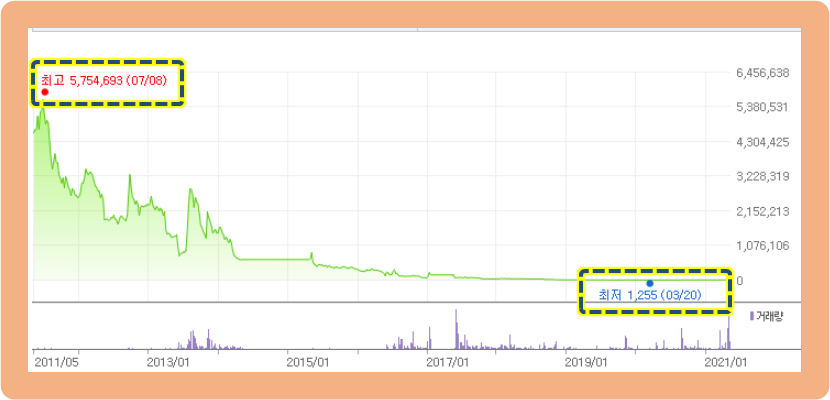과거 10년 동안 주가 추이를 보도록 하겠습니다. 최고점은 2011년 7월에 기록한 5,754,693원이고, 최저점은 2020년 3월에 기록한 1,255원입니다. 대부분의 조선업 관련 종목들이 그렇듯이 주가가 오랜 기간동안 매우 큰 폭으로 감소한 상황이네요.
