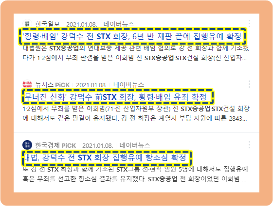 그리고 재판 6년 반이 지난 2021년 1월 8일,대법원은 특정경제범죄가중처벌등에관한법률위반 등 혐의로 기소된 강덕수 전 STX 회장에게 징역 3년에 집행유예 4년을 최종 확정했다고 발표했습니다.