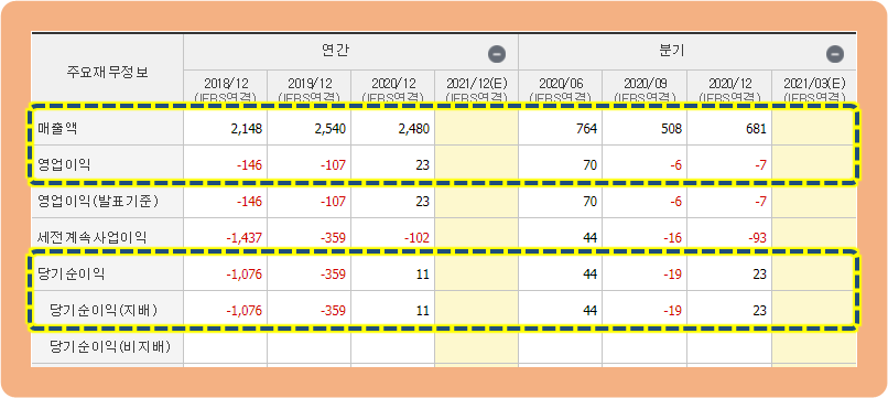 영업이익 - 2018년도 : -146억원 / 2019년도 : -107억원 / 2020년도 : +23억원을 기록하면서, 2020년도 기준으로 흑자 전환에 성공했네요.