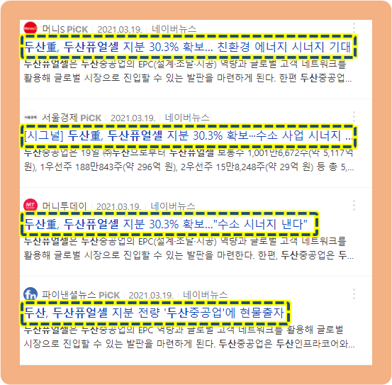 2021년 3월 18일, 두산중공업은 두산이 보유하고 있는 두산퓨얼셀의 지분 전량을 현물출자 받고 제3자 배정방식을 통해 두산에 배정한다고 발표했습니다.