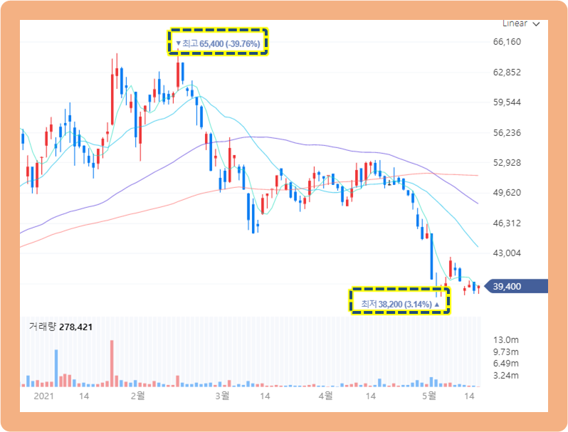 이후 조정을 받으면서 주가는 하락세로 전환되었습니다. 그리고 하락이 지속되면서 2021년 5월 4일에는 최저점 38,200원까지 떨어졌구요.