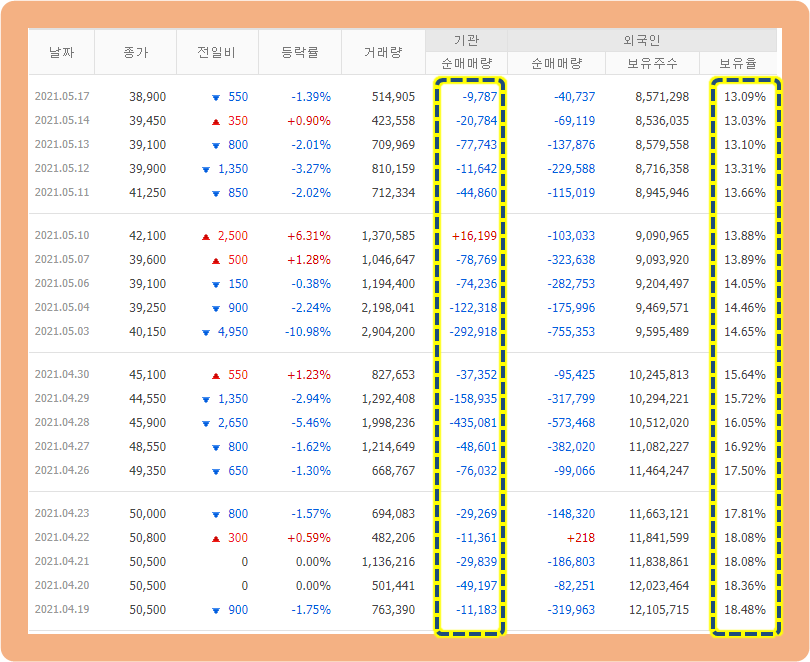 그리고 외국인 투자자의 지분율을 보시면, 한 달 전 18%에서 최근 13%대까지 내려왔네요.