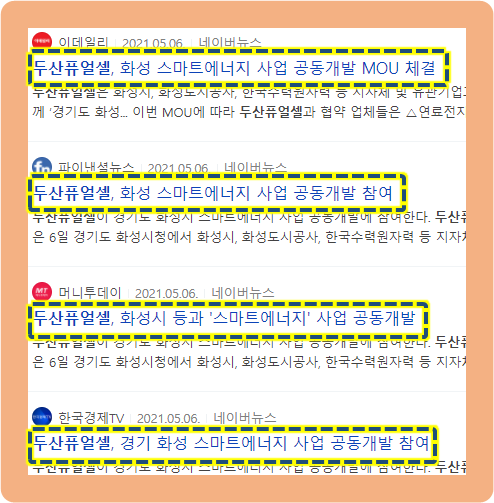 2021년 5월 6일, 두산퓨얼셀이 화성시청에서 화성시, 화성도시공사, 한국수력원자력 등 관련기업들과 함께 화성 스마트에너지 사업 공동개발을 위한 MOU를 체결했다는 소식이 발표되었습니다.