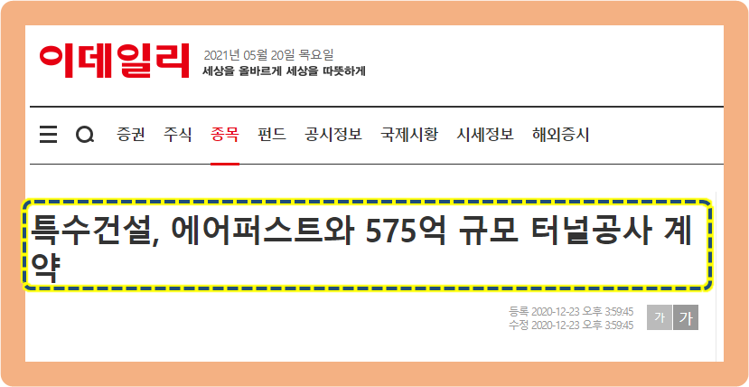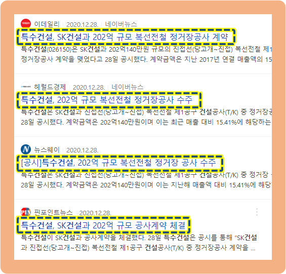 그리고 5일 뒤인 2020년 12월 28일, 특수건설은 SK건설과 약 202억원 규모의 진접선(당고개~진접 구간)의 복선전철 제1공구 건설공사 중 정거장공사의 관한 계약을 체결했다는 공시를 발표했습니다.