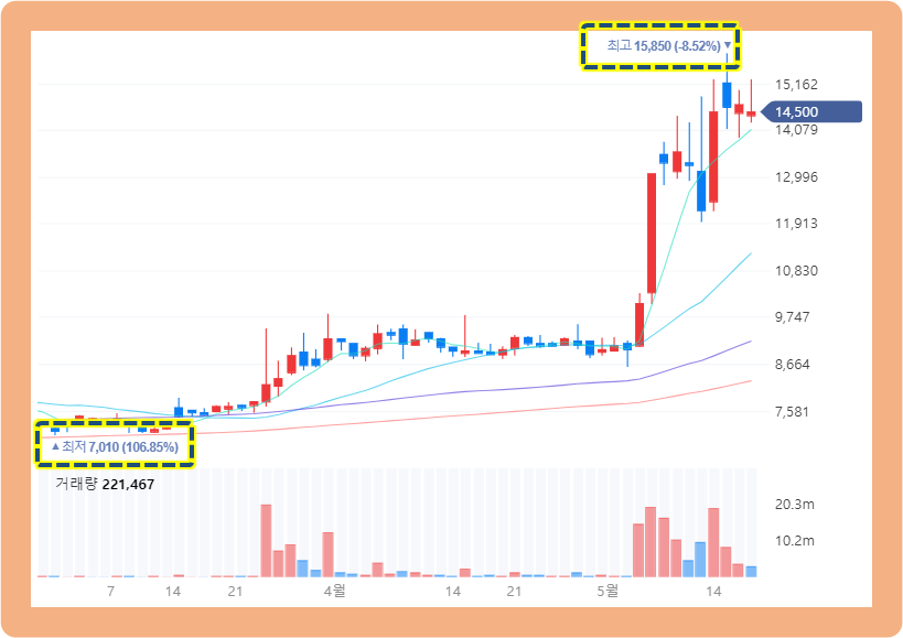 그리고 횡보가 끝난 시점인 2021년 5월 6일, 주가가 다시 급등하면서 치솟기 시작하더니 2021년 5월 15일에는 최고점 15,850원까지 터치한 상황입니다.