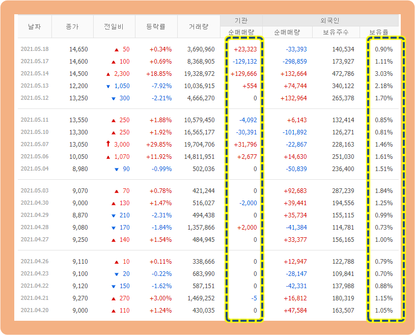 지난 한 달 동안 기관 투자자 및 외국인 거래 동향