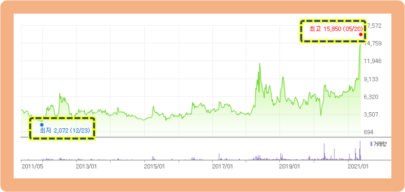 최저점은 2011년 12월에 기록한 2,072원이고, 최고점은 최근 2021년 5월 20일에 기록한 15,850원입니다.