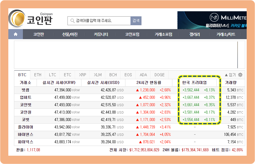 그런데 사진을 보시면, 코인판에서는 비트코인의 프리미엄밖에 확인할 수 없는데요.