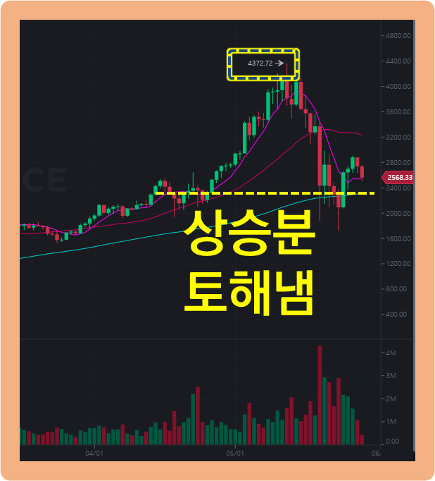 지금은 비트코인 하락장이 더욱 강세를 보이면서 이더리움도 힘을 못쓰게 되었고, 결국 하락 전환한 상황입니다.