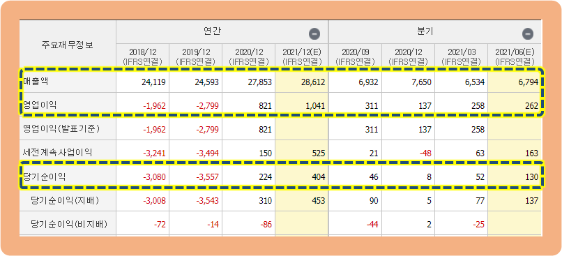 그리고 당기순이익을 보시면, 2018년도와 2019년도에 -3,000억원대 손실을 기록하고 있었는데요.
