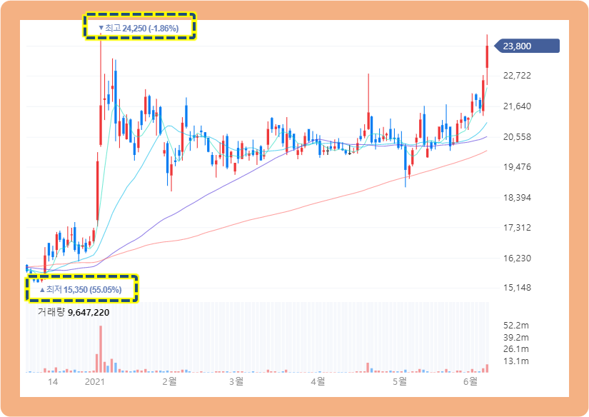 2021년 6월 7일 기준으로 23,800원에 장을 마감했는데, 직전 전고점인 24,250원까지 얼마 남지 않았네요.
