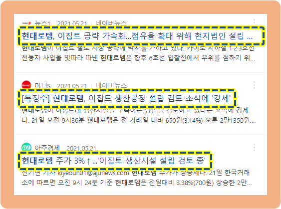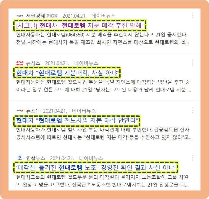 이에 대해서 바로 다음 날인 2021년 4월 21일, 현대자동차는 공시를 통해 '현대로템의 지분 매각을 추진하고 있지 않고 있다'라는 공시를 발표했습니다.